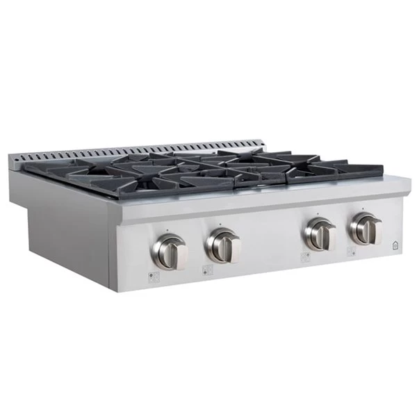 This expertly engineered 30-in gas range top features bold front control knobs and a design that will give your kitchen a professional look. The burners allow you to cook from a high heat for boiling, frying, or searing, to a low simmer for the most delicate sauces. The removable griddle/grill is perfect for preparing large meals.