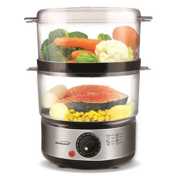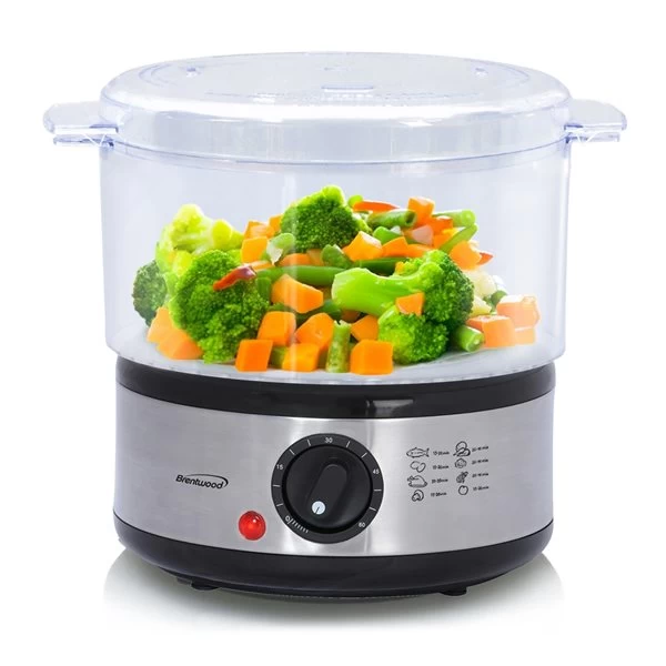 Use the powerful 400-watt Brentwood food steamer to make deliciously healthy meats, vegetables, eggs and more. Steaming retains more nutrients and cooks without butter and oil for healthier eating. Use the 60-minute timer and have a full dinner within an hour. The unit automatically shuts off when water is gone. Cool-to-the-touch, removable steam trays and lids are clear so you can see food steam.