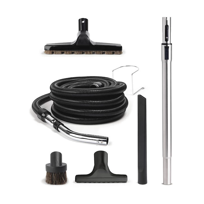 - Standard Air Tool Kit includes : 30 feet straight air hose, metal hose hanger, telscopic wand, hard floor brush, uphostery tool, dusting brush as well as a crevis tool