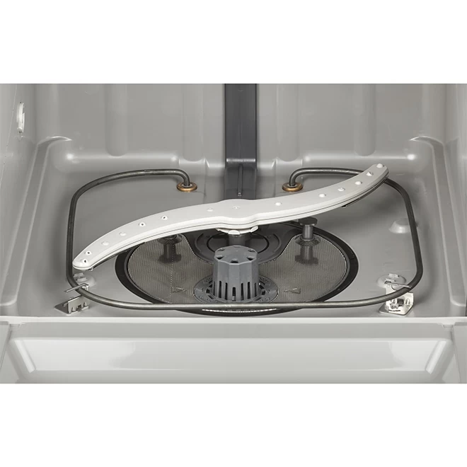 - Piranha(TM) hard food disposer with removable filter – to ensure consistently clean items, this stainless steel blade rotates at 3,600 RPM to pulverize food particles and helps to prevent large particles from clogging the wash arms