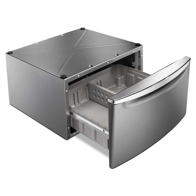 Doing laundry is easier with this Whirlpool laundry pedestal. The pedestal raises your front-load washer or dryer, so you don’t have to bend or strain when removing or adding laundry. The pedestal includes a convenient storage drawer to hold laundry supplies such as detergent and softener. The chrome handle is a stylish accent on this pedestal that ensures a comfortable grip when opening and closing the storage drawer. It features a chrome shadow finish to complement your laundry machines and is easy to install..