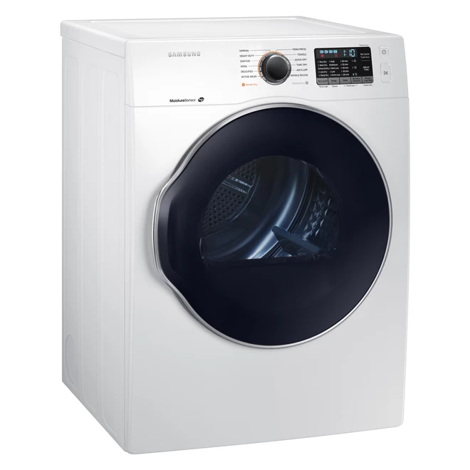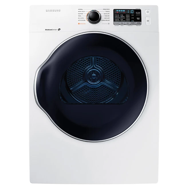Get great drying performance in a compact size with this Samsung Electric Dryer. Sensor Dry technology monitors and adjusts temperature and time to ensure optimized performance, while Moisture Sensor technology shuts down the dryer automatically when clothes are dry. The dryer has 8 drying cycles to tackle your laundry needs. The Wrinkle Prevent setting offers intermittent tumbling with unheated air at the end of the drying cycle to prevent wrinkling, while the My Cycle setting saves your setting preferences for future use. The compact dryer works with the Samsung Smart Care monitoring system that lets you troubleshoot and diagnose problems using a smartphone app. Stacking kit included. It is highly recommended to use a 4″ (10.2 cm) diameter rigid aluminum or galvanized steel duct with this product.
