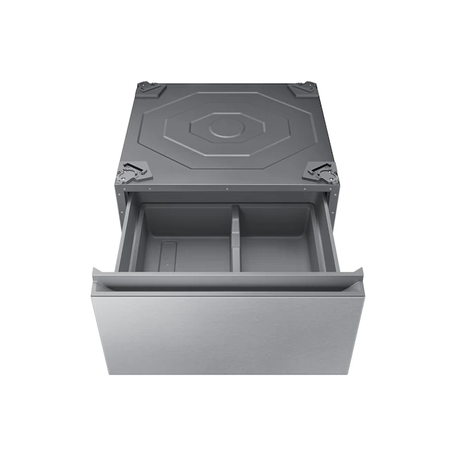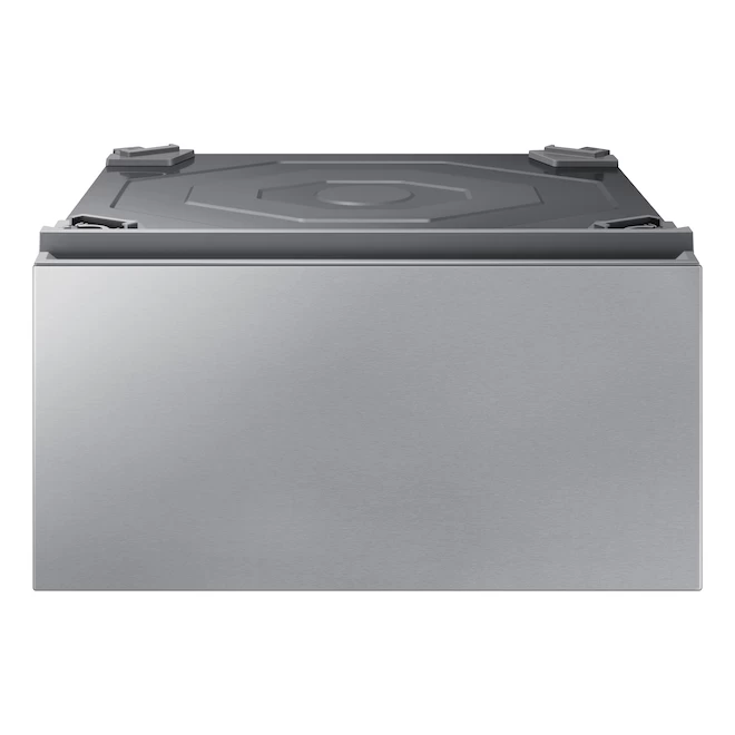 This 27-in Samsung Bespoke front load washer pedestal is intended for use with 89/87/6700 series laundry in stainless steel.