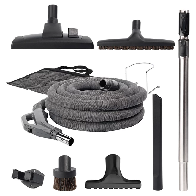Venmar’s deluxe vacuum accessory kit includes everything you need to clean your hard flooring and carpets. It includes 1 deluxe multi-surface/combo floor brush, 1 deluxe hard floor brush, 1 mesh storage bag, a 30-foot-long low-voltage hose, 1 hose sock, 1 hose hanger, 1 telescopic wand for static tools, 1 wand hanger, 1 round dusting brush, 1 upholstery tool and 1 long crevice tool. You can count on a 3-year warranty on the hose and a 1-year warranty on accessories.