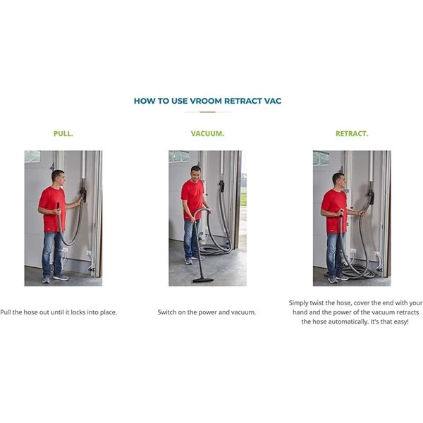 - Vroom Retract Vac brings the speed and convenience of central vacuum retractable hose systems to your garage: Just pull out the hose, vacuum any mess and retract back in seconds!