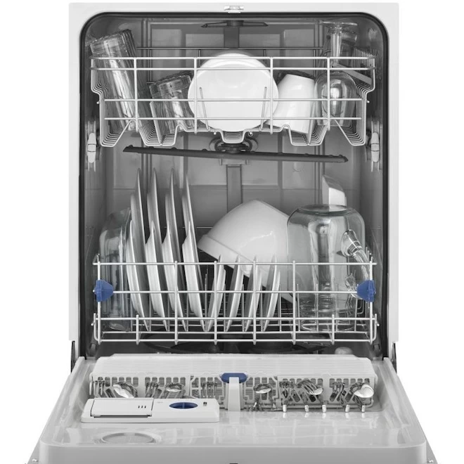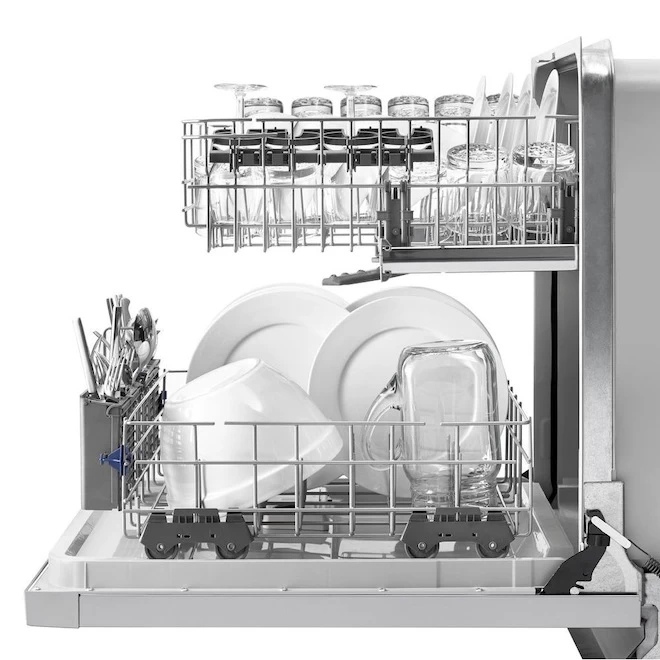 - In-door silverware basket frees up rack space by easily fitting on the front of the lower rack or in the door to make room for more dishes