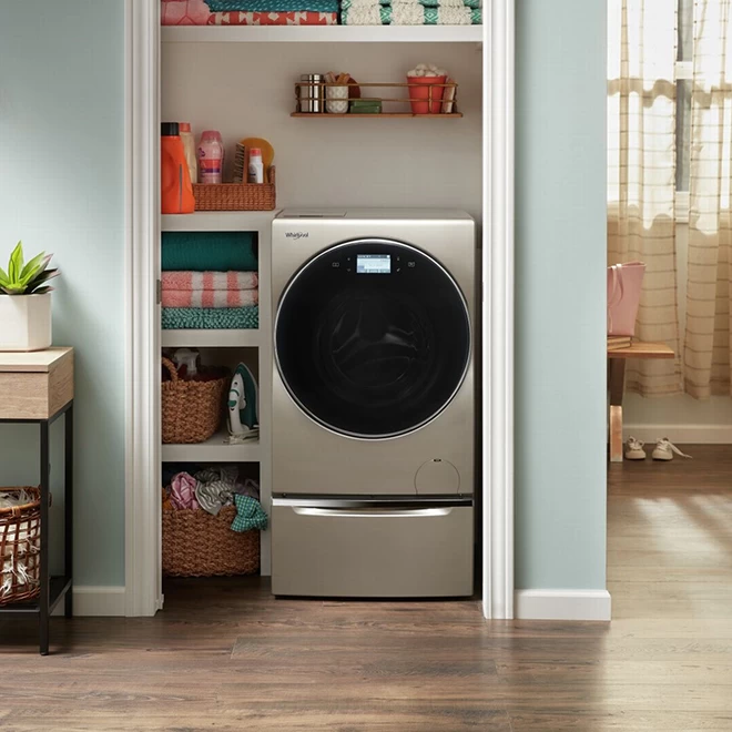 Raise your all-in-one smart washer-dryer with the Whirlpool(TM) laundry pedestal. It makes loading and unloading laundry easy, and also provides storage space for detergents, fabric softeners and other supplies. This pedestal comes with a 1-year limited warranty (parts and labour).